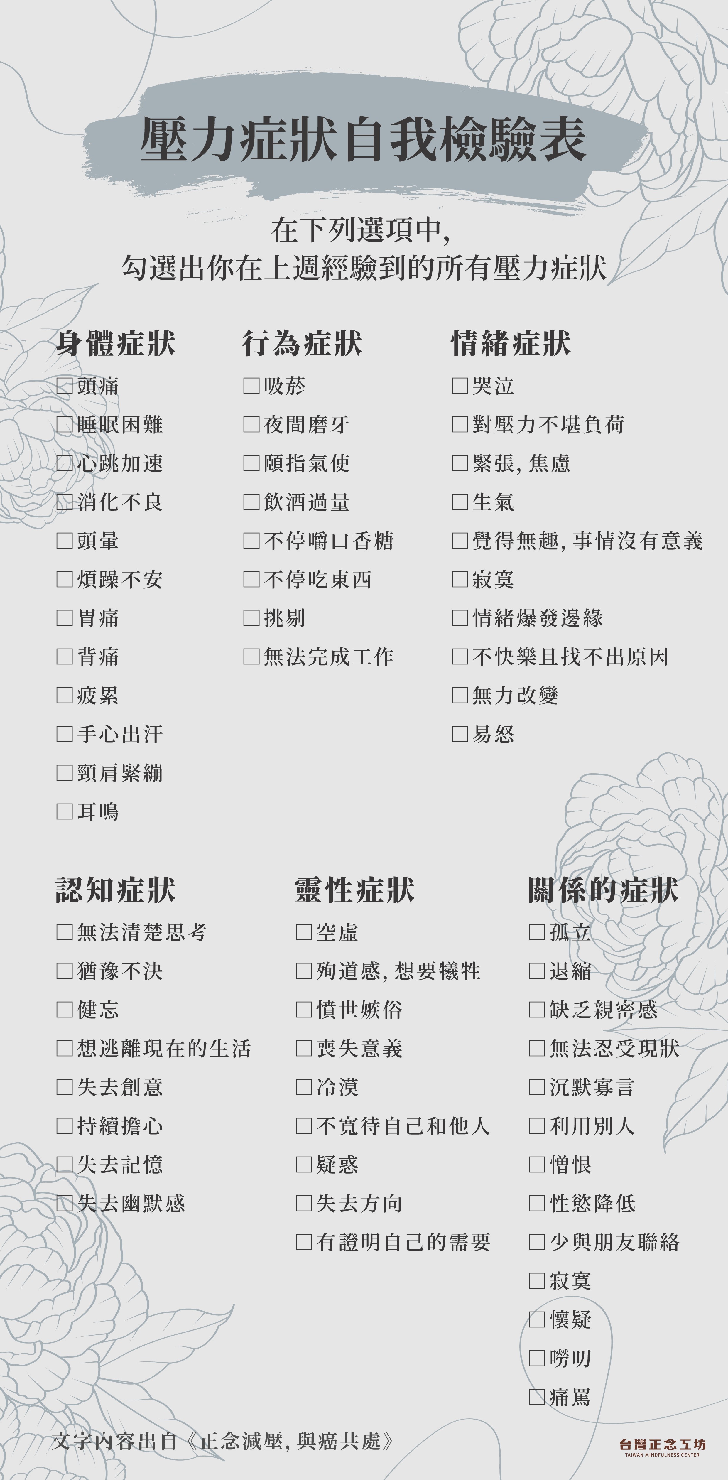 「根據研究顯示,長期暴露於壓力中,無法把身體帶回和諧的狀態,你的身體和情緒可能更容易受到各種不同疾病的影響。」 --《正念減壓,與癌共處》